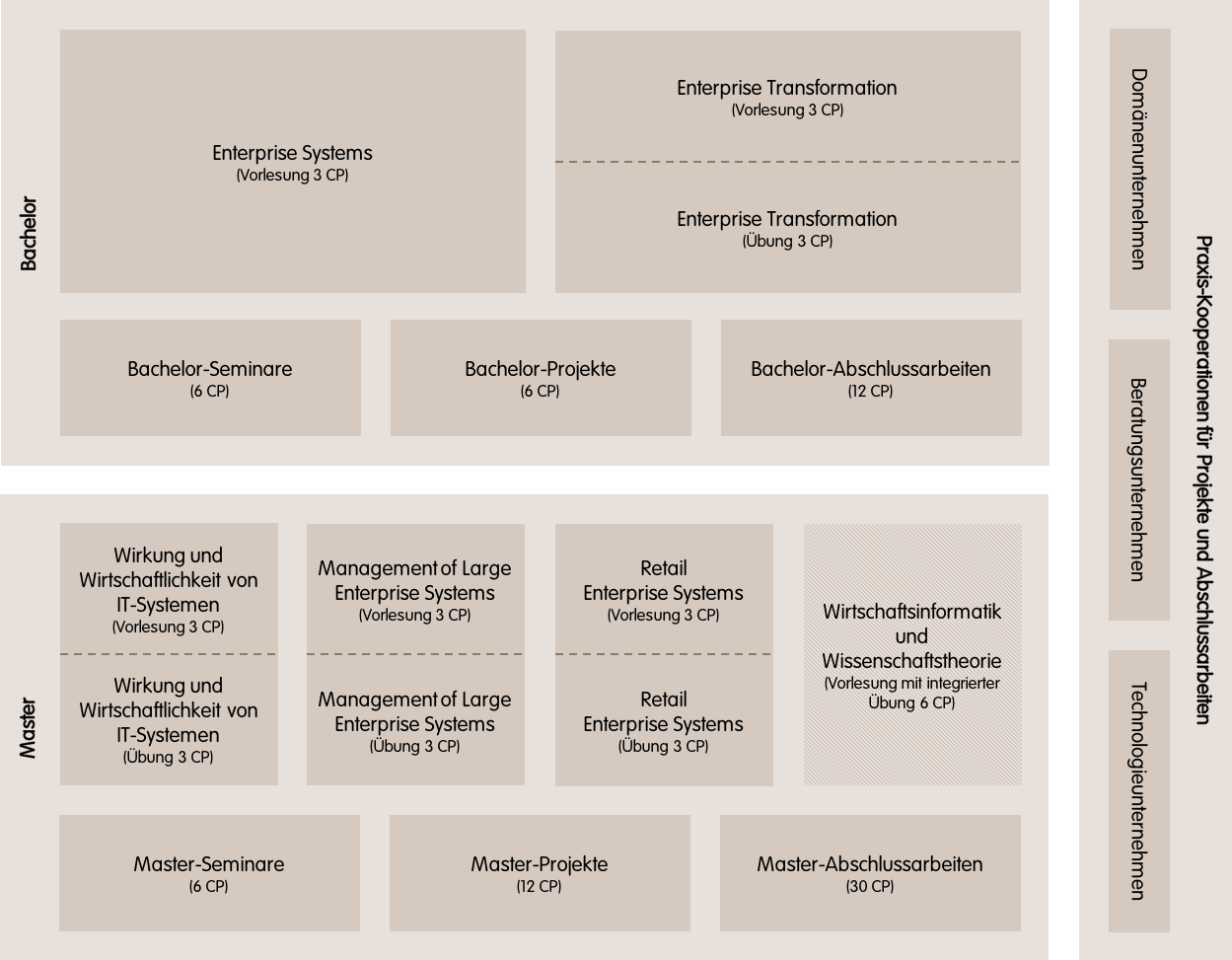 The scope of this module relies in large enterprise systems. The focus lies especially on the management of these systems. On this account, it is further concentrated on the selection, implementation, and maintenance of enterprise systems. Selected problems that relate to management aspects are additionally explained to students.
