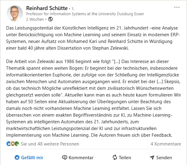 Wir freuen uns, dass der Beitrag „Das Leistungspotential der Künstlichen Intelligenz im 21. Jahrhundert–eine Analyse unter Berücksichtigung von Machine Learning und seinem Einsatz in modernen ERP-Systeme“ von Prof. Dr. Reinhard Schütte und Dr. Mohamed Kari in der Festschrift "Produktions- und Informationsmanagement" für Prof. Dr. Stephan Zelewski veröffentlicht wurde.