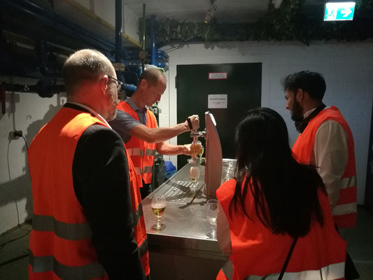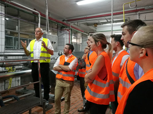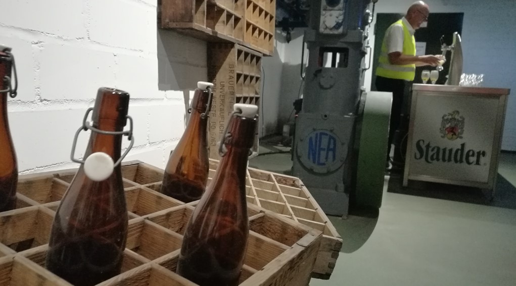 Offiziell begann die Führung mit der obligatorischen Aushändigung der orangen Warnwesten, sodass niemand übersehen wurde oder verloren ging. Nach einem Gruppenfoto wurden wir ins Stauder-Museum geleitet, in dem die beiden Geschäftsführer Axel und Thomas Stauder die Geschichte und das Konzept ihres in sechster Generation geführten Familienunternehmens in einem kurzweiligen Einführungsvideo präsentierten. Danach ging es weiter zu den verschiedenen Stationen des Brauprozesses – wie dem Sudhaus, der hauseigenen Hefereinzucht und der vollautomatischen Flaschenabfüllanlage – welche uns jeweils anschaulich erklärt wurden.