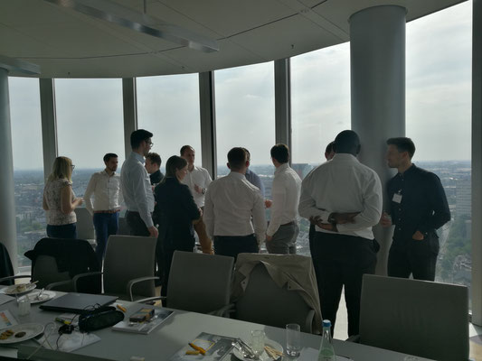 Zu Beginn der Veranstaltung wartete bereits ein kleines Highlight auf die Teilnehmer, denn es ging mit dem Fahrstuhl hoch hinaus. Angekommen im 22. Stockwerk der Firmenniederlassung wusste eine atemberaubende Sicht auf Düsseldorf zu überzeugen und das ein oder andere Foto wurde als Andenken geschossen. Neben Snacks und Getränken haben sich die Teilnehmer sowie das Unternehmen in einer kurzen Vorstellungsrunde bekannt gemacht. Im Anschluss daran ging es auch direkt mit dem praktischen Teil der Veranstaltung los. Denn auf die Teilnehmer von IIS-Talents warteten spannende Case Studys, die es zu lösen galt. Da es sich bei den Aufgabenstellungen um echte Herausforderungen aus dem Unternehmensalltag handelte, war das Interesse natürlich groß. Die angebotenen Themen erstreckten sich von Process Mining über Robotic Process Automation bis hin zu Predictive Analytics. Während der Bearbeitung der Case Studys erhielt man umfangreiche Unterstützung von den anwesenden Mitarbeitern und interessante Denkanstöße für das weitere Vorgehen. Neben den interessanten Einblicken in die zum Teil unbekannten Technologien, die in dem Unternehmen zum Einsatz kommen, durfte man einen ersten Einblick in die spannenden Fragestellungen aus der Praxis erhalten. Im Anschluss an die Bearbeitung durften die Teilnehmer in Form eines kleinen Wettbewerbs ihre Ergebnisse den Anwesenden präsentieren. Als Belohnung wartete sogar ein kleiner Preis auf die Gruppe, die am besten zu überzeugen wusste. Zum Ausklang des Tages durften sich die Teilnehmer bei einem leckeren Buffet und der tollen Aussicht auf Düsseldorf mit den Mitarbeitern und den anwesenden Kollegen austauschen.
