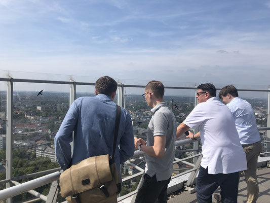 Nach den Präsentationen ging es quer durch den Essen Hauptbahnhof rüber zum RWE-Turm, dem mit 127 Metern höchstem Gebäude in Essen. Hier hatten wir die einmalige Gelegenheit, einmal ganz nach oben auf die Aufsichtsplattform zu fahren und einen atemberaubenden Anblick über das gesamte Essener Stadtgebiet zu erhaschen. Dank des guten Wetters und der klaren Sicht konnten wir an diesem Tag gut und gerne 30 Kilometer weit sehen. Nach diesem interessanten Ausblick kehrten wir zurück zum vorherigen innogy-Gebäude, wo wir danach noch einiges zu der IT-Abteilung erfuhren, bspw. über deren Arbeitsweise oder vergangene Projekte. Hierbei war es auch besonders interessant zu erfahren, dass innogy ein eigenes, quasi „hauptberufliches“ E-Sport Team hat.