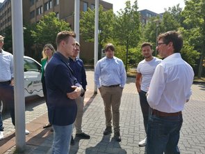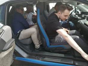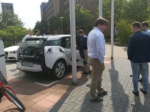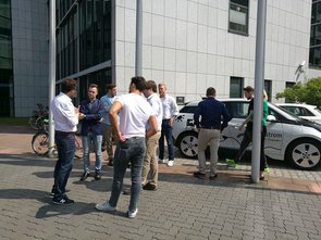 Ein weiteres Thema, mit dem sich die naturstrom AG befasst, ist die Elektromobilität und der damit verbundene Einsatz von Ladesäulen. Um diese Thematik für uns greifbarer zu machen, wurde uns vor dem Firmengebäude eine Ladesäule gezeigt und erklärt sowie eine Mitfahrt in einem Elektroauto (BMW i3) ermöglicht. Danach war es Zeit für eine Mittagspause -mit Fingerfood und Kuchen-, in der interessante Gespräche entstanden und die bereits besprochenen Inhalte vertieft wurden. Im Anschluss erläuterte uns Herr Hesselmann den Einsatz von sowie die Aufgabenfelder der IT im Unternehmen. Diese wird zum einen benötigt, da das Unternehmen mit 400 PC-Arbeitsplätzen an 13 Standorten sowie drei Rechenzentren mit 100 Servern und 70 IT-Systemen dezentral organisiert ist und zum anderen für das Prozess- und Qualitätsmanagement mit den Themengebieten Datenschutz und Dokumentation sowie für die Entwicklung und die IT-Infrastruktur, die sich mit der Entwicklung von Software und der IT-Infrastruktur befasst und letztendlich noch für das Applikationsmanagement, worunter ERP-Systeme, das Kundenportal und der IT-Betrieb zusammengefasst werden. Abschließend wurden bereits durchgeführte IT-Projekte wie Ladekarten für Ladesäulen und das Lastenrad (Donk-EE), bei dem der Kunde in Köln elektronische Lastenräder ausleihen kann, vorgestellt. Der Fokus lag dabei auf Fragestellungen, wie die Daten über Ausleih- oder Ladevorgänge zur Weiterverarbeitung an die naturstrom AG gelangen? Weiterhin wurden noch künftige IT-Projekte und Herausforderungen, denen sich die IT in der Zukunft stellen muss, angesprochen.