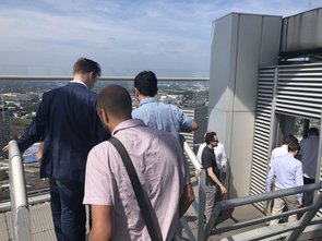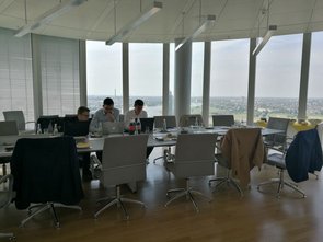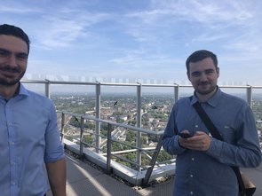 Nach den Präsentationen ging es quer durch den Essen Hauptbahnhof rüber zum RWE-Turm, dem mit 127 Metern höchstem Gebäude in Essen. Hier hatten wir die einmalige Gelegenheit, einmal ganz nach oben auf die Aufsichtsplattform zu fahren und einen atemberaubenden Anblick über das gesamte Essener Stadtgebiet zu erhaschen. Dank des guten Wetters und der klaren Sicht konnten wir an diesem Tag gut und gerne 30 Kilometer weit sehen. Nach diesem interessanten Ausblick kehrten wir zurück zum vorherigen innogy-Gebäude, wo wir danach noch einiges zu der IT-Abteilung erfuhren, bspw. über deren Arbeitsweise oder vergangene Projekte. Hierbei war es auch besonders interessant zu erfahren, dass innogy ein eigenes, quasi „hauptberufliches“ E-Sport Team hat.
