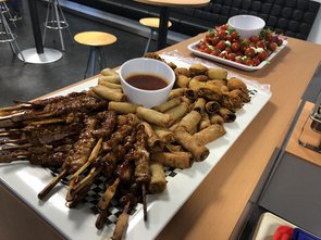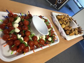 Nach einer kurzen, mit einem Quiz verbundenen Einführung über das Unternehmen wurde es für uns nun Zeit, einmal selber kreativ zu werden: Es ging darum, in Gruppen eigene und neue Geschäftsideen für sogenannte „Smart Poles“ zu entwerfen. Dabei handelt es sich um Straßenlaternen, welche auf verschiedene Art und Weise zu einer intelligenten Infrastruktur beitragen können. Beispielhafte Anwendungszwecke hierfür sind die Bereitstellung von Wi-Fi und die Anzeige von Werbung, Informationen für die Einwohner sowie Umwelt- & Wetterdaten. Nachdem wir uns in Gruppen zusammengefunden hatten, konnten wir uns nun in von innogy bereitgestellten Konferenzräumen „ausleben“ und Ideen sammeln. Nach dem jede Gruppe sich schließlich für eine Idee entschieden hatte war es nun die Aufgabe, die Idee vorzustellen und eine „Jury“ aus innogy-Mitarbeitern davon zu überzeugen. Im Vorfeld hatten wir allerdings noch die Möglichkeit, uns mit köstlichem Fingerfood zu stärken und mental auf die Präsentation vorzubereiten.
