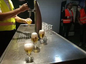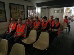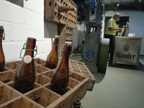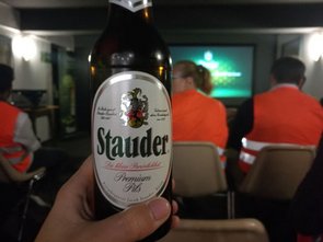 Offiziell begann die Führung mit der obligatorischen Aushändigung der orangen Warnwesten, sodass niemand übersehen wurde oder verloren ging. Nach einem Gruppenfoto wurden wir ins Stauder-Museum geleitet, in dem die beiden Geschäftsführer Axel und Thomas Stauder die Geschichte und das Konzept ihres in sechster Generation geführten Familienunternehmens in einem kurzweiligen Einführungsvideo präsentierten. Danach ging es weiter zu den verschiedenen Stationen des Brauprozesses – wie dem Sudhaus, der hauseigenen Hefereinzucht und der vollautomatischen Flaschenabfüllanlage – welche uns jeweils anschaulich erklärt wurden.
