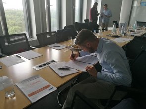 "Das Event bei innogy startete mit einem kurzen Spiel zum Kennenlernen des Unternehmens. Als ein führendes Energieunternehmen mit einem Umsatz von 43 Milliarden € und mit ca. 42.000 Mitarbeitern in 16 Ländern bedient die innogy um die 23 Millionen Kunden, was der Bevölkerung von Dänemark und den Niederlanden zusammen entspricht. Die Gesamtkapazität der von innogy zur Verfügung gestellten Energie von 3,9 GW wird durch erneuerbare Energien wie Windenergie und Wasserenergie produziert. Damit leistet innogy einen wichtigen Beitrag zur Energiewende. Nach einer Lockerungsübung wurden uns verschiedene Persona zur Auswahl geboten, welche potentielle Kundengruppen einer Neuentwicklung von innogy, einer sog. „smart pole“ (smarte Straßenlaterne ), repräsentierten. Nach der Findung der Gruppen war es unsere Aufgabe mithilfe des Design-Thinking-Ansatzes der Kreativität freien Lauf zu lassen und Ideen für Funktionen der smart pole in Bezug auf eine bestimmte Persona zu entwickeln. Dabei entstanden auch total verrückte oder kaum umsetzbare Ideen, aber genau darum ging es bei dieser Übung – Ideen im Hinblick auf das Problem und unabhängig von der Lösung zu kreieren. Die unterschiedlichen Ideen wurden anschließend in Form eines Rollenspiels präsentiert. Als nächstes durften wir alle gemeinsam den Ausblick auf das Ruhr-Gebiet aus dem 27. Stock des innogy-Turms genießen. Abschließend stellte sich der Bereich Digital Lab vor und erzählte uns von ihren Methoden in der Softwareentwicklung sowie der HR-Bereich, der hilfreiche Tipps für die Bewerbung mitgebracht hatte. Zum Abschluss hatten wir die Möglichkeit uns mit den Mitarbeitern der innogy zu unterhalten und Kontakte zu knüpfen. Insgesamt ein sehr gelungenes Event!" (Anastasia Sklarow, IIS-Talents Teilnehmer)