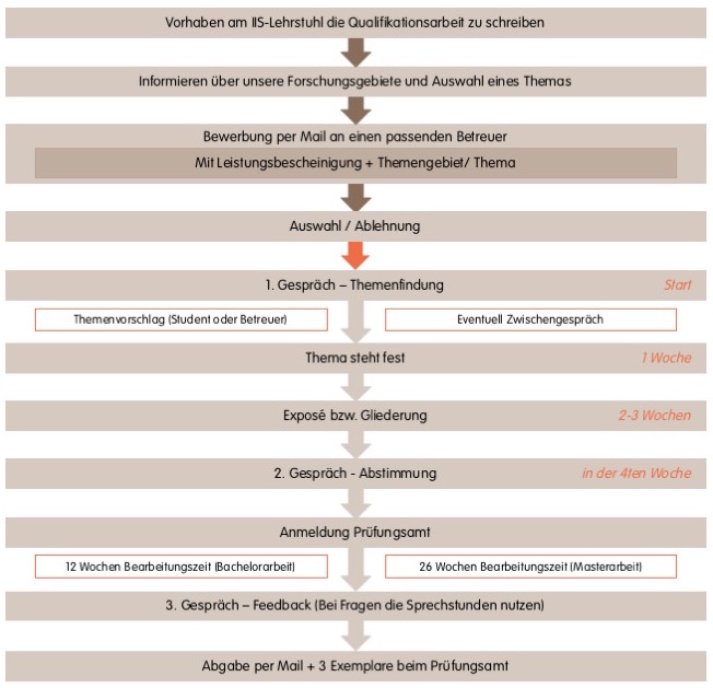 Des Weiteren empfehlen wir Ihnen, dass Sie bereits vorab die Seminararbeit oder die Projektarbeit an unserem Lehrstuhl schreiben. Somit sind Sie bereits mit der groben Vorgehensweise und den zur Verfügung gestellten Vorlagen vertraut. Sie können sich somit komplett auf den Inhalt der Abschlussarbeit fokussieren.